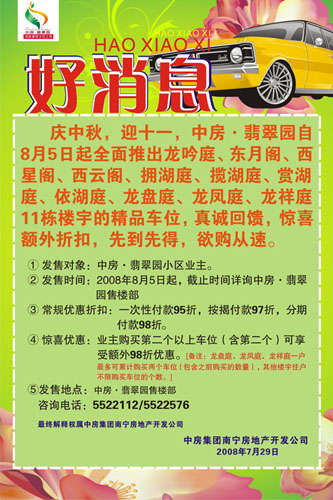 慶中秋,迎十一,中房·翡翠園自85日起全面推出龍吟庭、東月閣、西星閣、西云閣、擁湖庭、攬湖庭、賞湖庭、依湖庭、龍盤庭、龍鳳庭、龍祥庭11棟樓宇的精品車位,真誠(chéng)回饋,驚喜額外折扣,先到先得,欲購(gòu)從速。